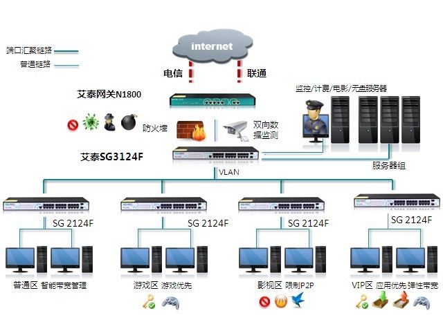 客戶選擇去網(wǎng)吧的很大一個(gè)原因就是為了體驗(yàn)高速?zèng)_浪的樂趣和游戲永不掉線,而由于P2P軟件的盛行,其對(duì)帶寬的極大占用將極大的影響其它用戶的上網(wǎng)速度。艾泰網(wǎng)關(guān)彈性帶寬控制和管理聯(lián)動(dòng)交換機(jī)有效保障視頻、網(wǎng)游等數(shù)據(jù)的傳輸,限制P2P軟件的超大流量。