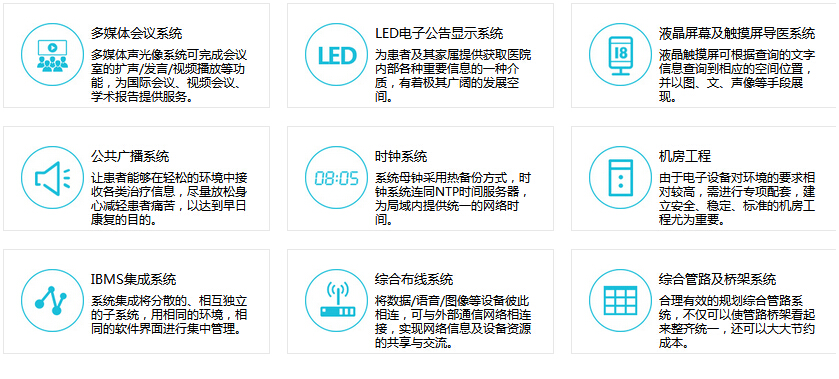本解決方案包括:綜合布線系統(tǒng)、安全防護系統(tǒng)、網(wǎng)絡服務系統(tǒng)、出入人員探視安全管理和排隊呼叫、病房呼叫等系統(tǒng)組成。